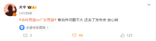赛后,广东男篮队记关辛报道焦泊乔的伤病问题表示:“焦泊乔问题不大,还去了发布会,放心哈!”
